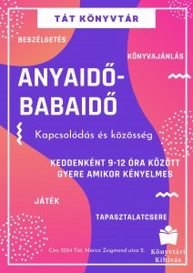 Anyaidő-Babaidő – minden kedden 9-12 óra között a könyvtárban by tatkultur · 2026-02-03 Anyaidő-Babaidő – minden kedden 9-12 óra között a könyvtárban Tölts egy kis minőségi időt magaddal és más anyukákkal!Miközben a babák játszanak, mi beszélgetünk, tapasztalatot cserélünk és feltöltődünk egy nyugodt, barátságos környezetben.