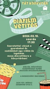 Diafilm vetítés a könyvtárban – 2026.02.18. by tatkultur · 2026-02-10 Retro Movie Night Instagram Story - 1 Diafilm vetítés a könyvtárban 2026.02.18. (szerda) 17.30 óra Szeretettel várjuk a gyerekeket és családokat egy vidám és izgalmas mese-diavetítésre a könyvtárban. A rendezvény ingyenes! Könyvtári Kihívás