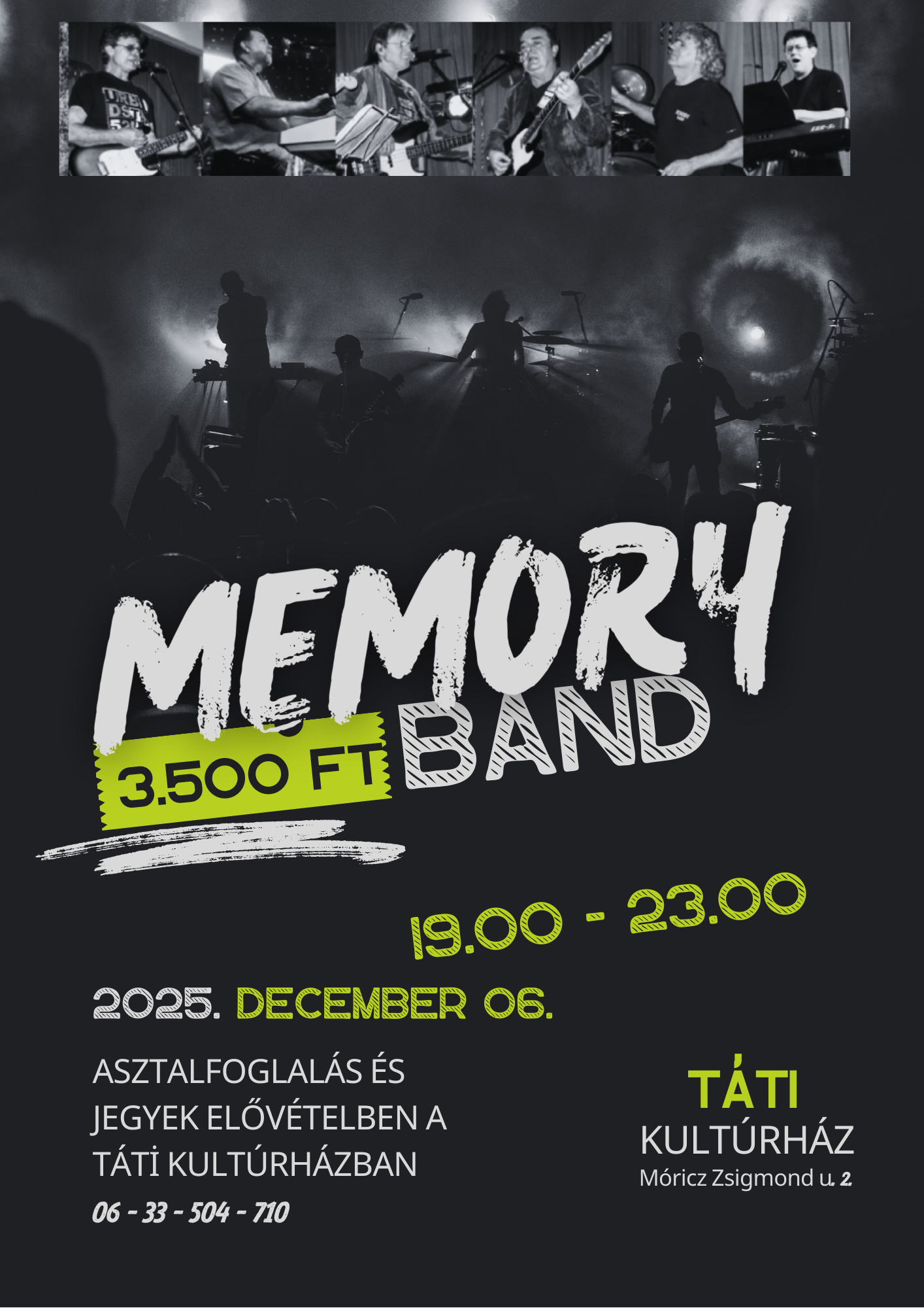 Memory Band – 2025. december 06. (szombat) by tatkultur · 2025-11-11 Memory Band 2025. december 6. (szombat) 19-23 óráig Belépő: 3.500 Ft Asztalfoglalás, jegyek elővételben: Táti Kultúrház, 2534 Tát Móricz Zsigmond u. 2. 06-33-504-710