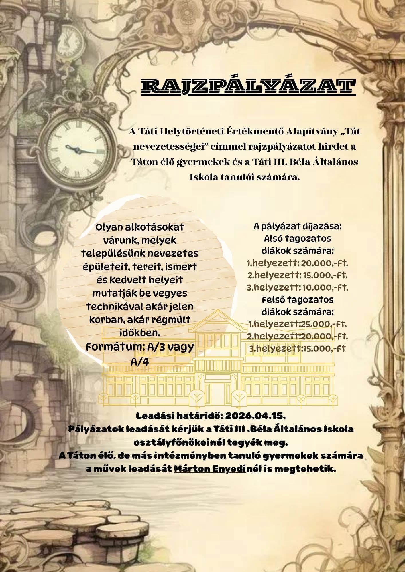 A Táti Helytörténeti Értékmentő Alapítvány „Tát nevezetességei” címmel rajzpályázatot hirdet a Táton élő gyermekek és a Táti III. Béla Általános Iskola tanulói számára.