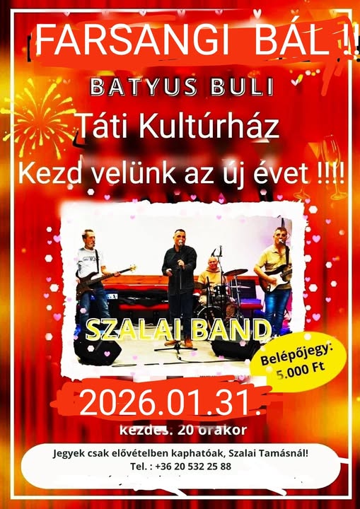 Szalai Band – Farsangi batyus buli – 2026.01.31. (szombat) by tatkultur · 2026-01-19 Szalai Band – Farsangi batyus buli 2026.01.31. (szombat) 20.00 Belépőjegy: 5.000.- Ft Jegyek csak elővételben kaphatók Szalai Tamásnál +36/20/5322588